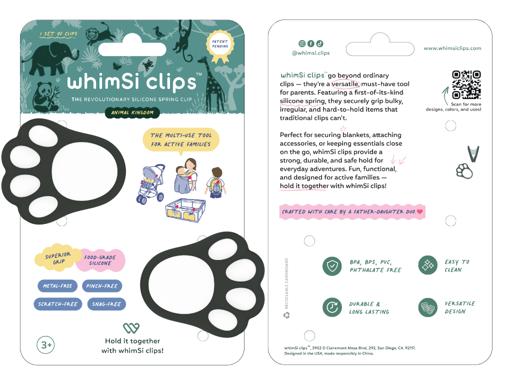 Meet Panda Paws, part of our Animal Kingdom Collection. Inspired by the gentle charm of pandas, this whimSi clip™ combines playful design with practical function. At its core is our patent-pending silicone spring—a first-of-its-kind innovation that’s soft, flexible, and safe for little hands, yet strong and versatile enough to be useful through every stage of childhood.